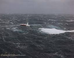 At that point we were starting to say “Well, that looks like page 49 of Adlard Coles’s Heavy Weather Sailing.’Until the front came through the sea conditions were reasonably OK; they were getting big, but they were regular and they had a good pattern. We gradually slabbed the main down to the smallest size and a small storm jib.