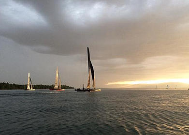Très en retard au niveau d’Evian, Sébstien Josse et le Gitana Team qui n’allaient pas tarder à enfin voler, démâte sous un grain. L’équipage est en sécurité et le bateau pris en remorque.